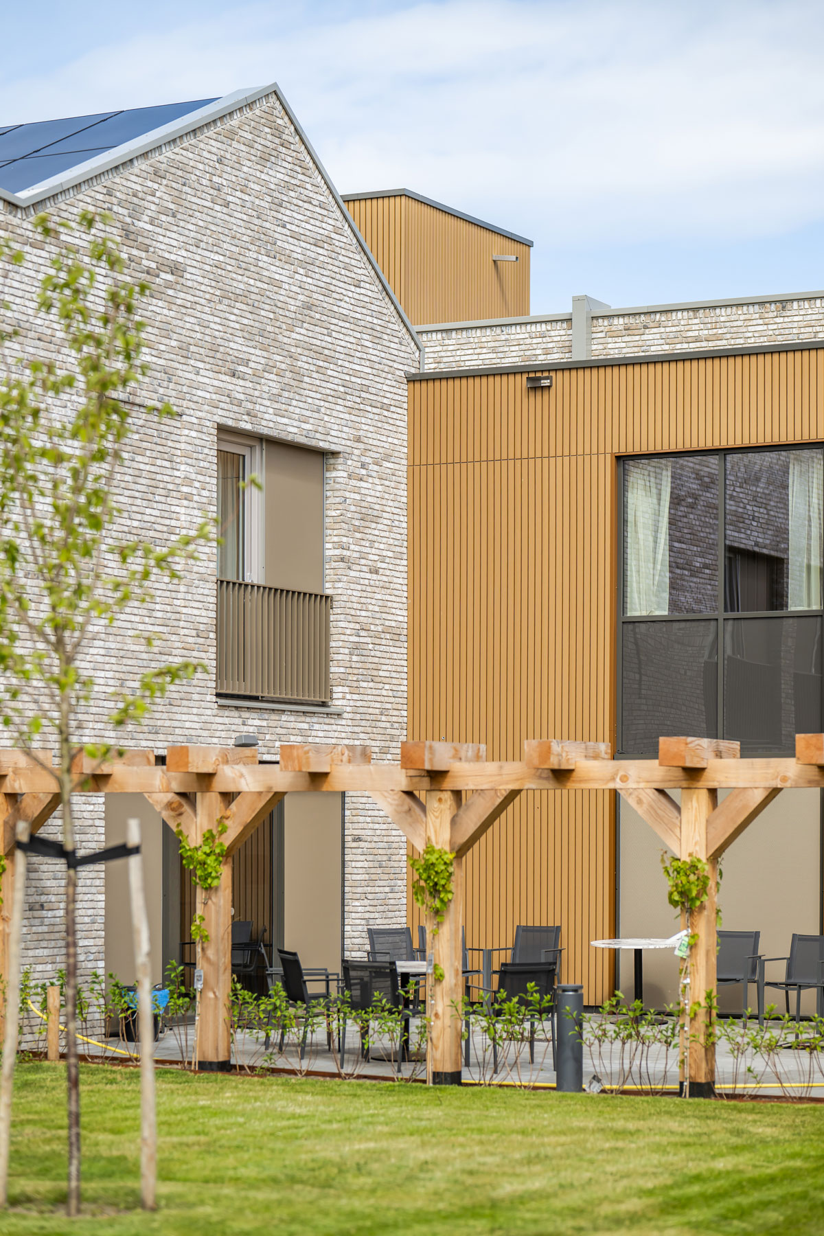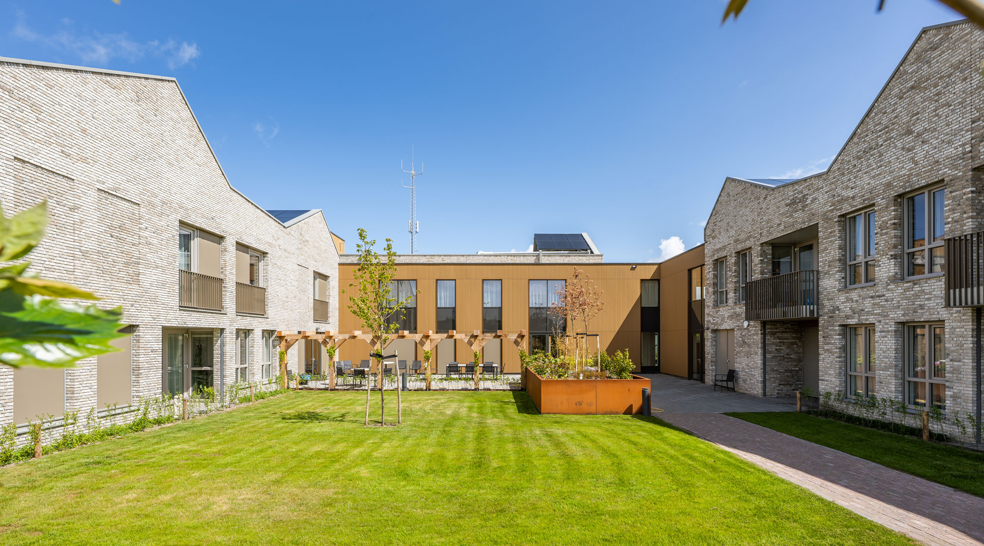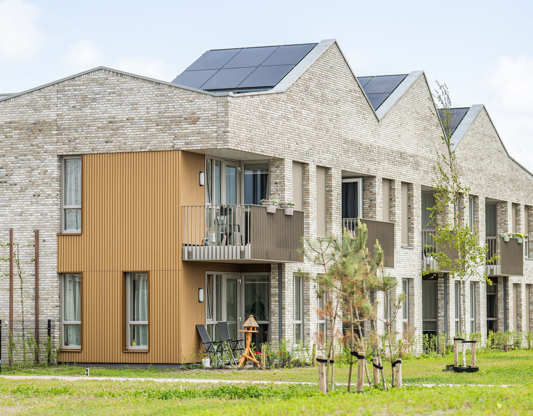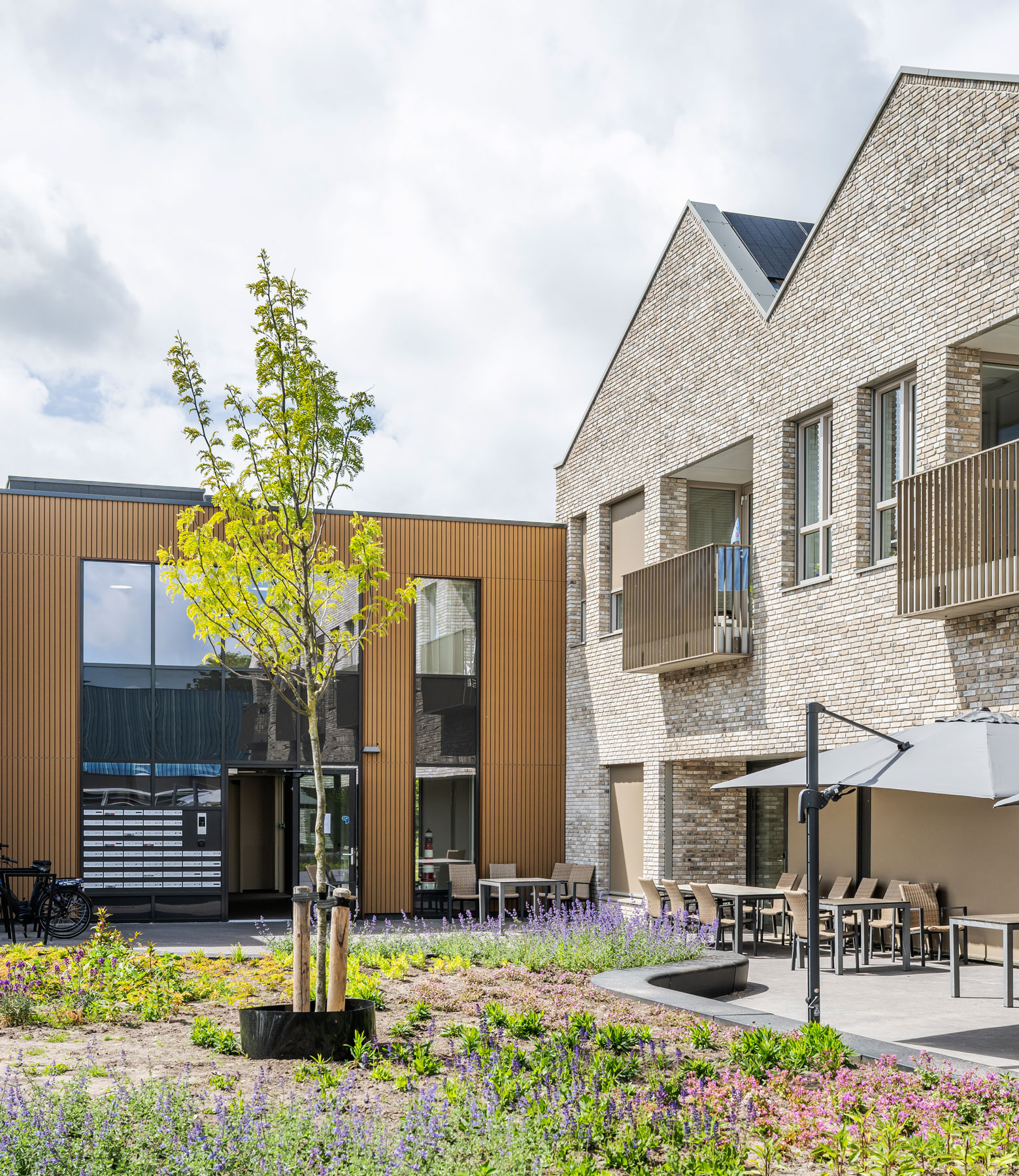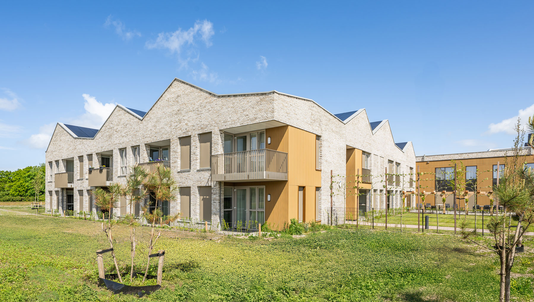 Bien plus qu’un bâtiment de soins résidentiel, les 44 appartements offrent aux habitants d’Ameland la possibilité de vivre toute leur vie sur l’île et de bénéficier de soins adaptés. Inspirée des anciens « bâtiments du commandeur » d’Ameland, l’architecture mêle tradition Néerlandaise et modernité avec ses toits asymétriques et son ambiance chaleureuse.